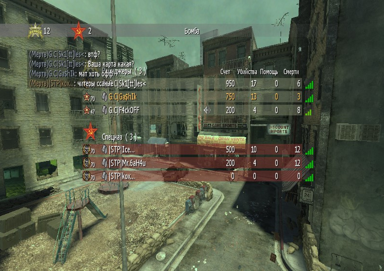 Играли с кланом |STP|, правил они вообще не знали, на первом же раунде долбили из нубомета, НО мы решили не ставить тп, а повеселиться дальше)) так как играть они тоже не умели и Нашу карту скидроу мы выиграли 12 2, а их терминал 12 0)))), канечно как всякая школота они нас называли читаками и тому подобное, НО!!! это еще не все, они захотели реванш!!!(это после такого проигрыша то), ну ок, мы согласились, но теперь нас было 2 а их 3) и это было еще веселее, первая карта была скидроу, все начиналось довольно хорошо 6 1) но потом они начали крысить, и в итоге мы всеравно выиграли 12 6, а потом они, ничего не говоря ушли, СКРИНЫ ниже